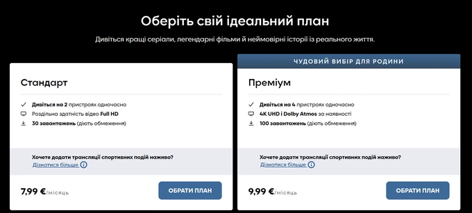 • пакет «Стандарт» доступний на двох пристроях одночасно у Full HD якості й дозволяє завантажувати до 30 епізодів. Платити за «Стандарт» треба буде 7,99 євро на місяць [приблизно 390 гривень]