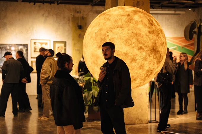 У центрі експозиції – «Місяць» Сергія Западні. Величезну кулю можна рухати: космічне світило, що зазвичай у небі, тепер опиняється під владою відвідувачів. Усі кошти з продажу світлової інсталяції перерахують на підтримку митців, які зараз на лінії фронту.
