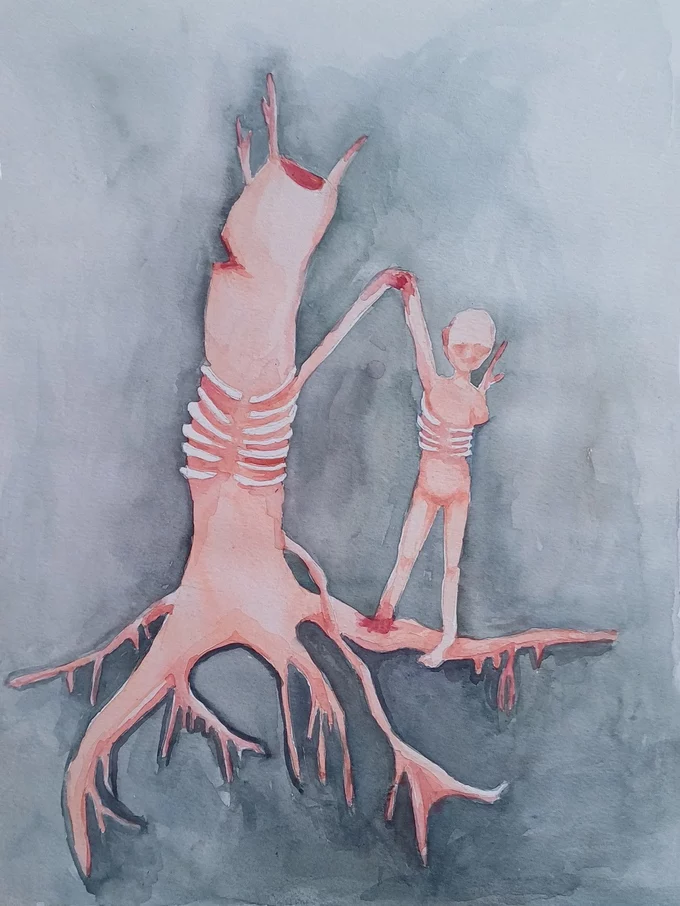 Оля Єрємєєва почала створювати живопис зовсім нещодавно. Кути кімнат, які вона малює, кровоточать, та її роботи не жахають цією кров’ю. Жах цих робіт полягає в тому, як він легко входить до людських осель і мімікрує під побутові речі; як люди звикають до війни чи втрат. Війна знеособлює багато речей, але робить досвід надзвичайно тілесним – коли ламаються дерева, ламаються тіла.