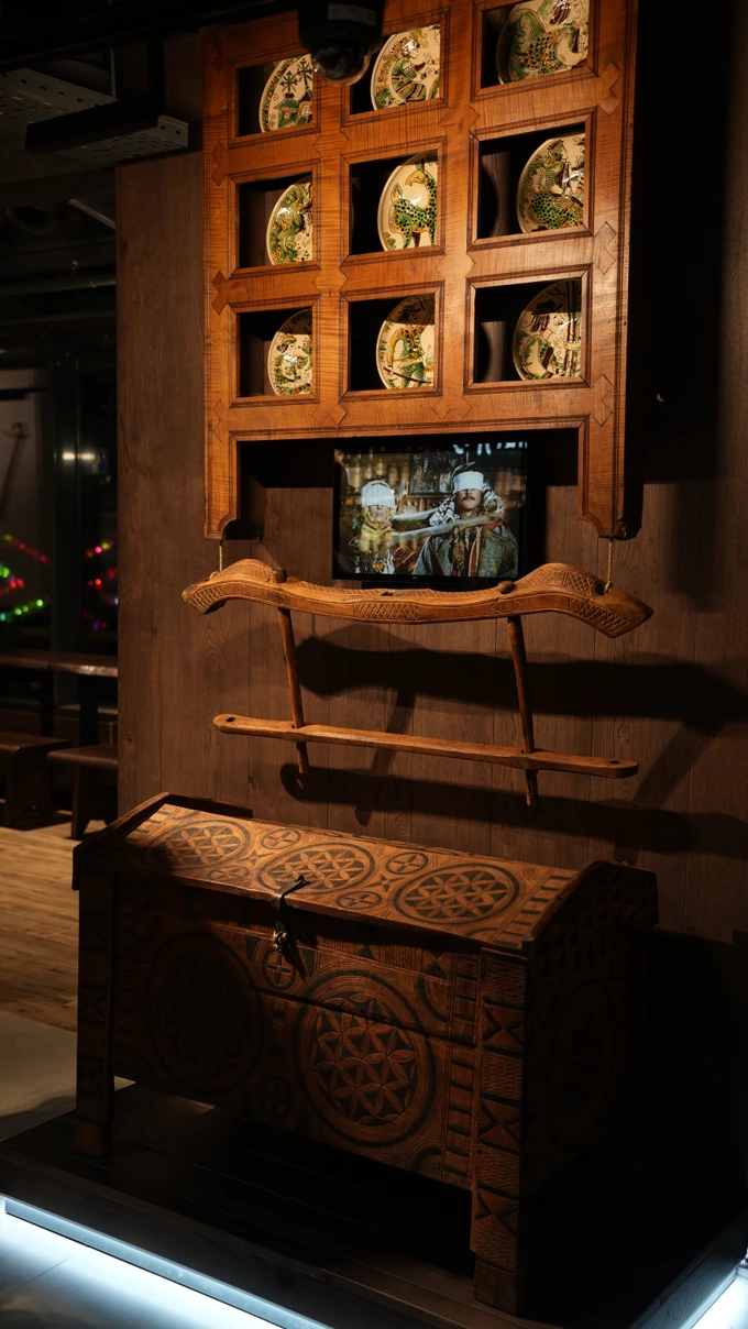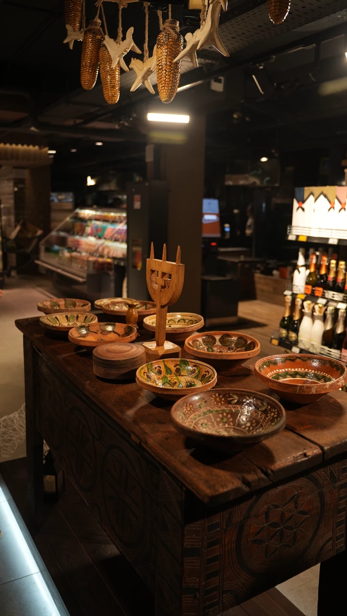 Майстер косівської кераміки Сергій Дудка, який переосмислює давні гуцульські мотиви, створив серію з девʼяти керамічних тарілок за сюжетами книги й кінофільму та декоративних керамічних сирних коників. Також є мисник, який ми купили на Косівському ринку, автентичні гуцульські меблі, деревʼяний посуд і кераміка. Старе й нове разом.