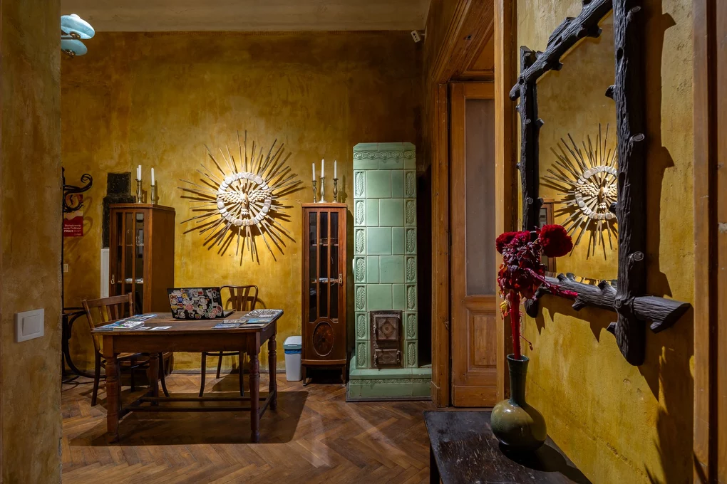 Художник Володимир Костирко, який зробив десятки дизайнів для ресторацій і культурних просторів Львова, і, по суті, є батьком львівського стилю з «патиною часу», створив портрет цісаря Франца Йосифа, який ми розмістили в дерев’яній рамці. Ця робота висить у зоні «Корчма», де відвідувачі можуть поїсти й випити кави. Такі портрети могли раніше висіти в кожній гуцульській хаті. А коли Георгій Якутович працював над оформленням фільму «Тіні забутих предків», то він теж стилізував на кіностудії корчму й повісив наївний портрет цісаря.