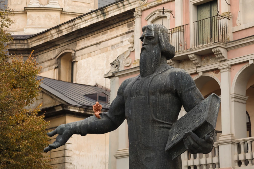 Скульптура-підсадка Дениса Шиманського «Час для себе» на пам'ятнику Івану Федоровичу у Львові