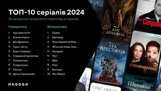 Медіасервіс Megogo представив найпопулярніші фільми, серіали, а також освітній, аудіо й безбарʼєрний контент за 2024 рік.