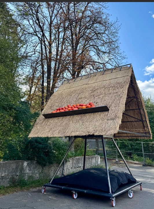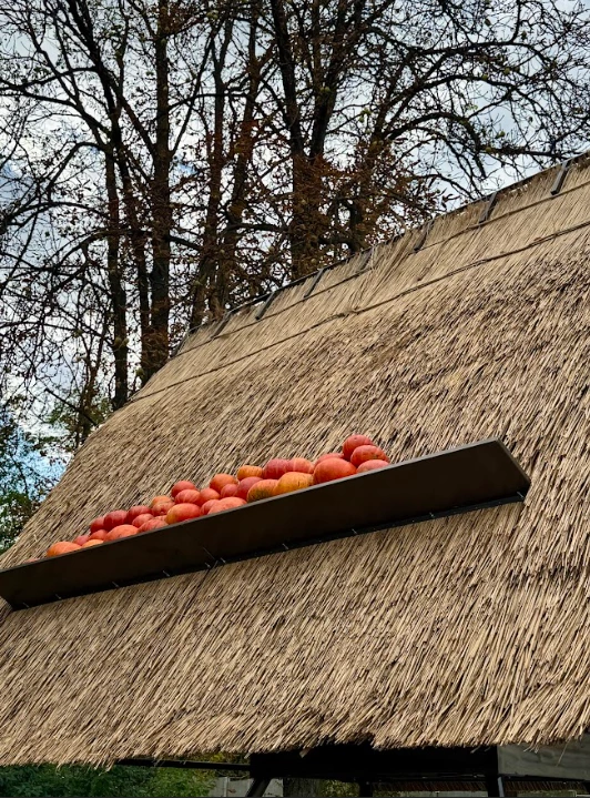 Дах стоїть на колесах, бо, хоч він і вкорінений у спадщину та спільноту, проте залишається вразливим до атак і переміщень. Попри це, на соломі залишили гарбузи, щоб вони дозріли й увібрали смак, пояснюють організатори.