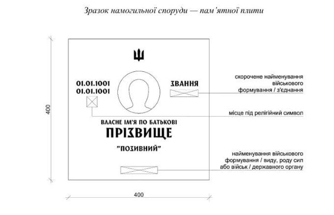 На колумбарній ніші встановлюватимуть намогильну споруду – пам’ятна плита із природного каменю світлого кольору. На лицьовій стороні каменя буде: