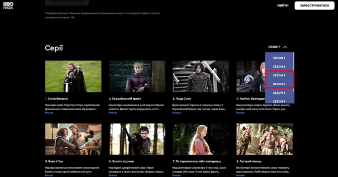На платформі HBO можна переглянути всі сезони «Гри престолів», окрім четвертого, де зʼявляється російський актор. Скриншот Віледжа