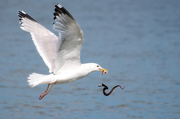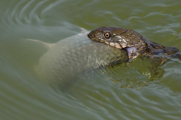 Водяний вуж зі здобиччю у природному парку «Тузловські лимани», Одеська область. Олег Марцун