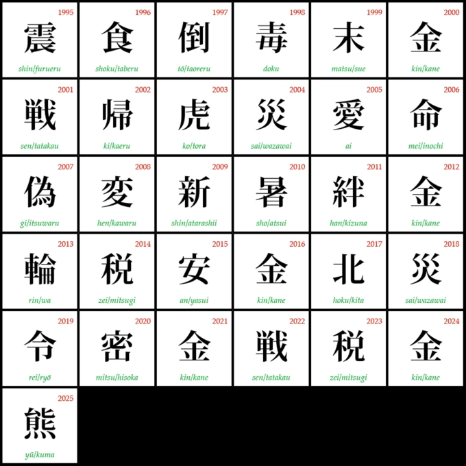 Список усіх кандзі року з моменту започаткування конкурсу в 1995 році. Nippon