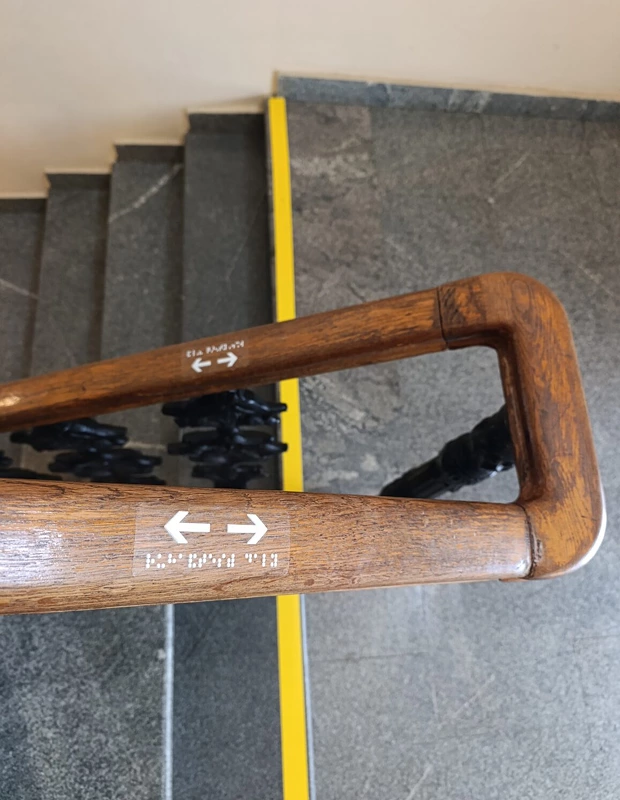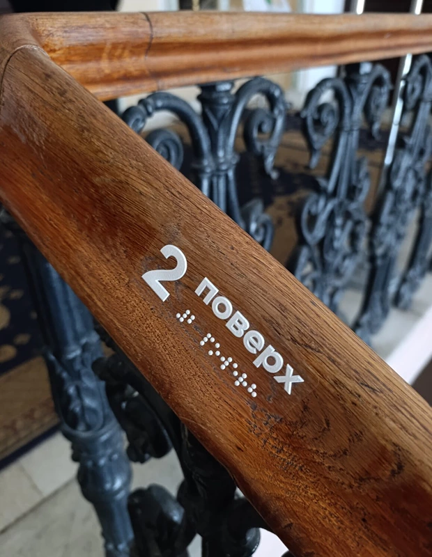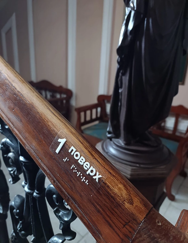 На перилах встановили тактильні вказівники, які допоможуть незрячим дістатися від входу до Колонної зали та Музичного салону. На першому та другому поверхах розмістили тактильні мнемосхеми – рельєфні плани приміщення. Вони допоможуть знайти гардероб, касу, а також ознайомитися з планом евакуації.
