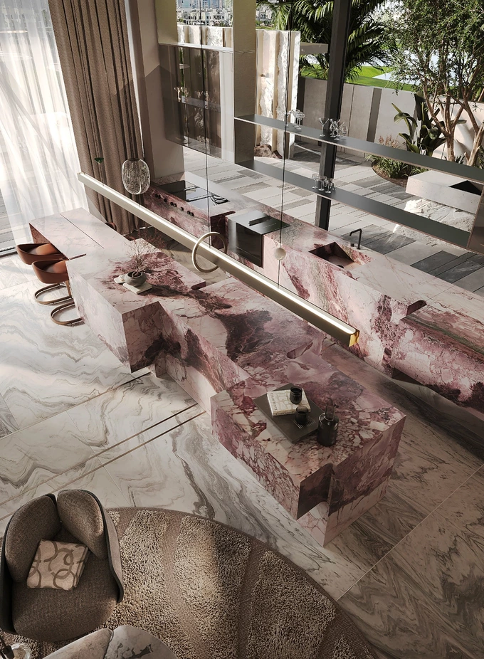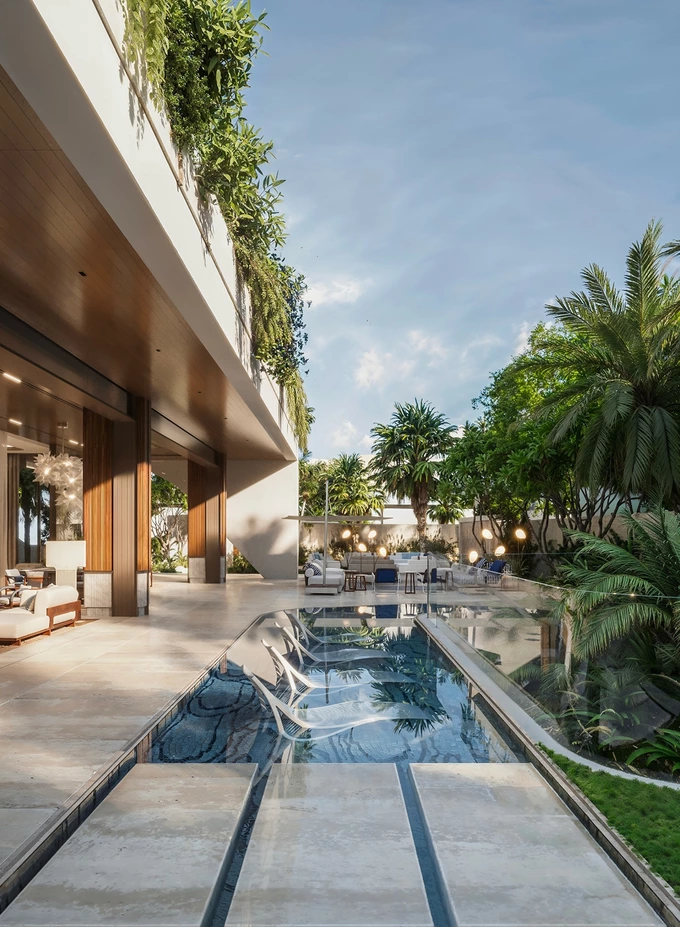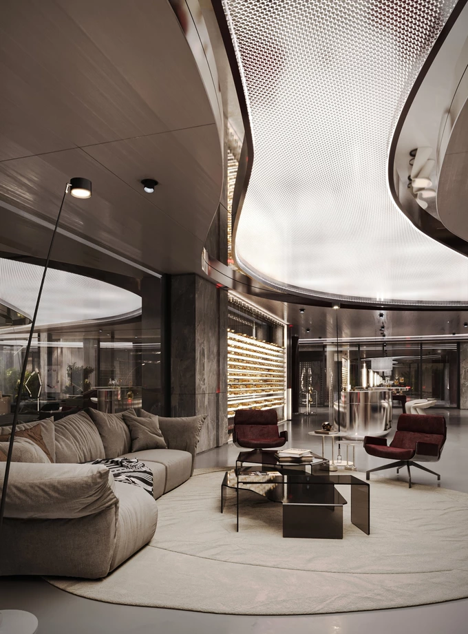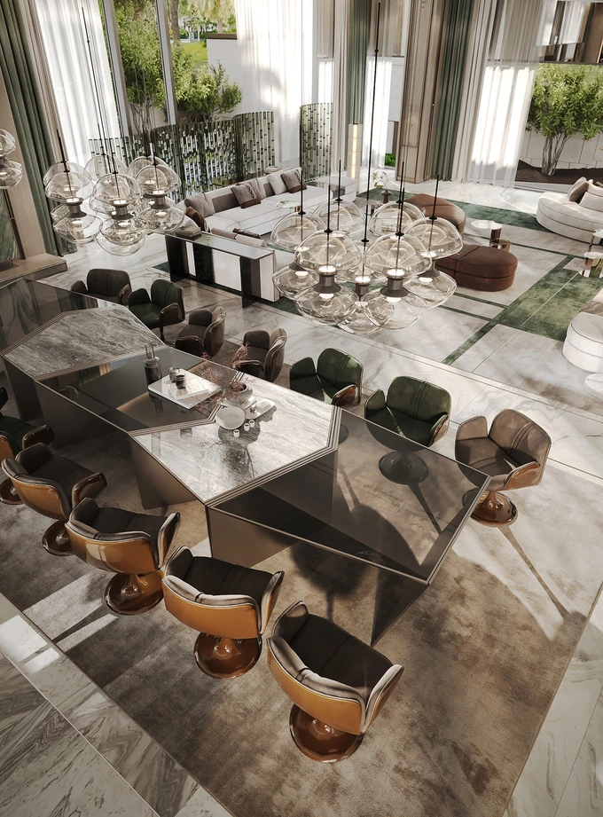 Вілла займає 2 500 м² і спроєктована як простір для сімейного життя з відкритими зонами для спілкування та відпочинку. Центральне місце займає велика обідня зона. Інтер’єр використовує природне світло та прості матеріали для створення комфортної та спокійної атмосфери.