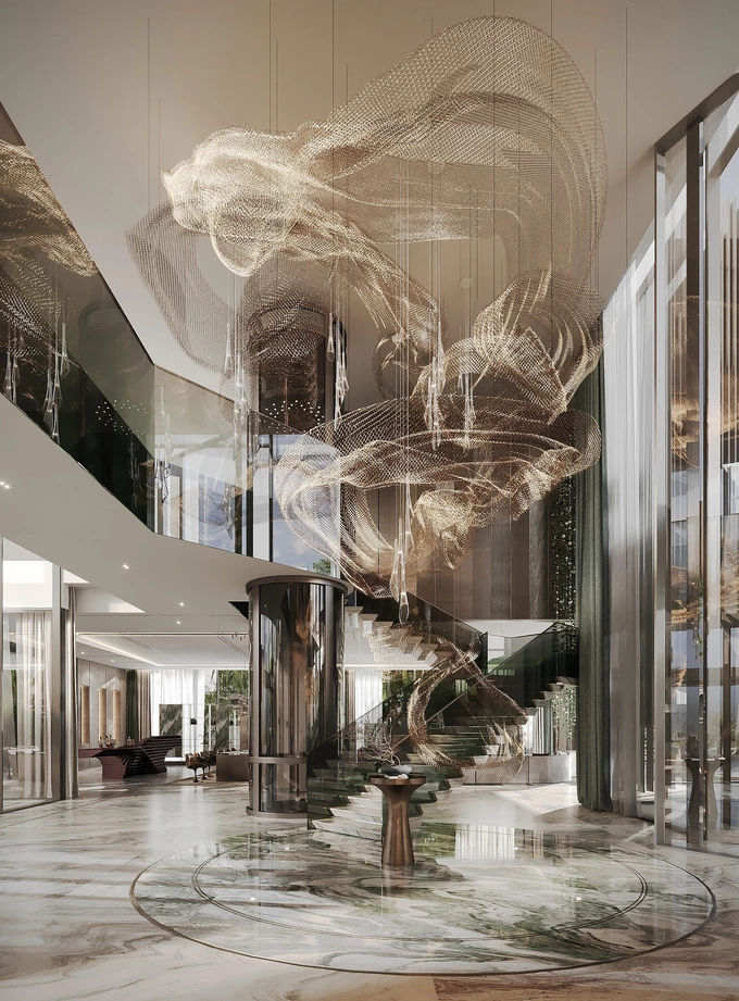 Вілла займає 3 500 м² і спроєктована як функціональний простір з чітким плануванням. У центрі будинку – куб, а чотири тераси відокремлюють різні частини вілли та створюють різний настрій для відпочинку. В інтер’єрі використали природні форми.