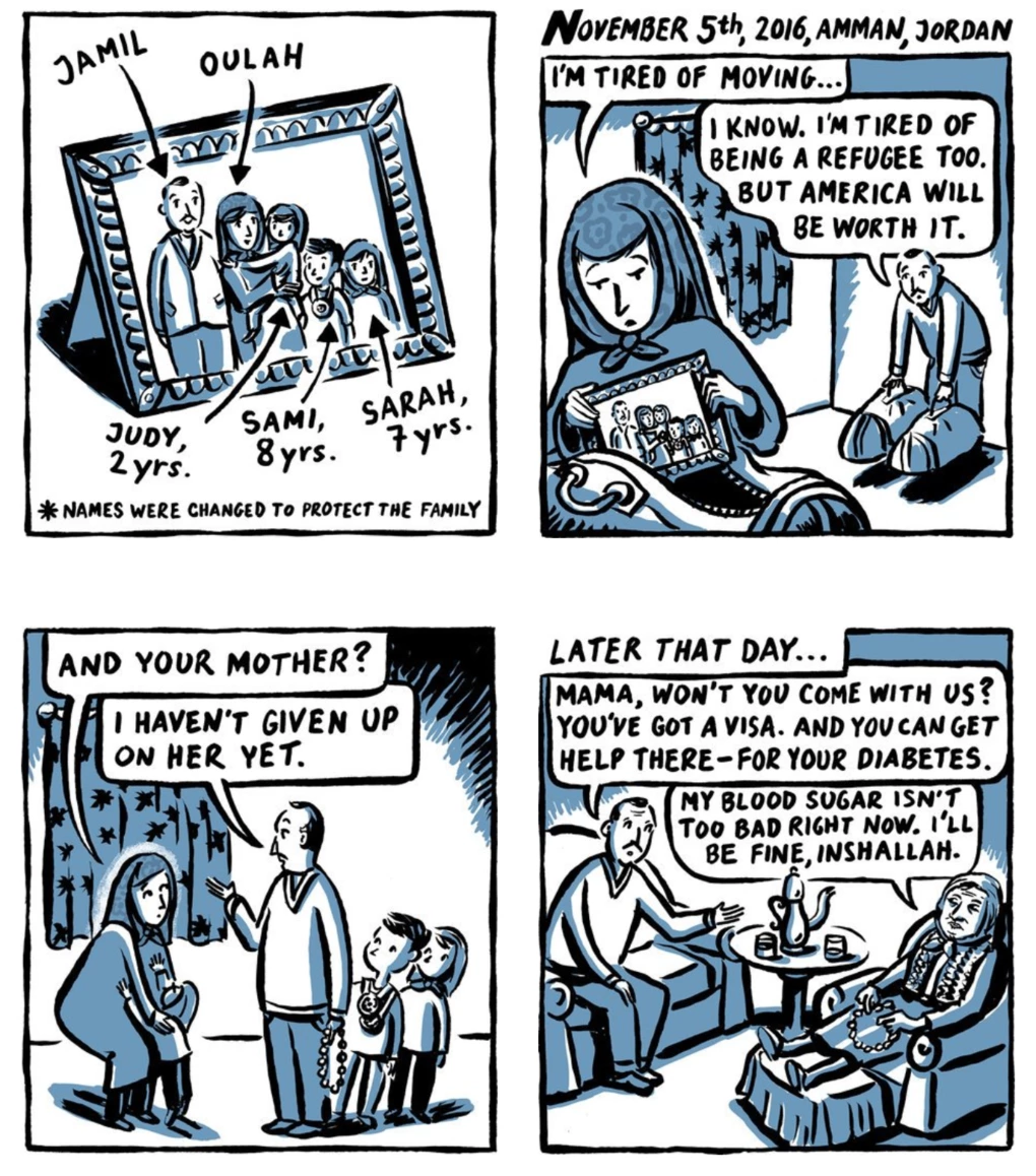 «Ласкаво просимо до Нового світу» – серія з 20 карикатур від The New York Times про двох сирійських біженців, які прилетіли до Сполучених Штатів у день перемоги Дональда Трампа на президентських виборах. Малюнки побудували на низці інтерв’ю зі справжніми людьми.