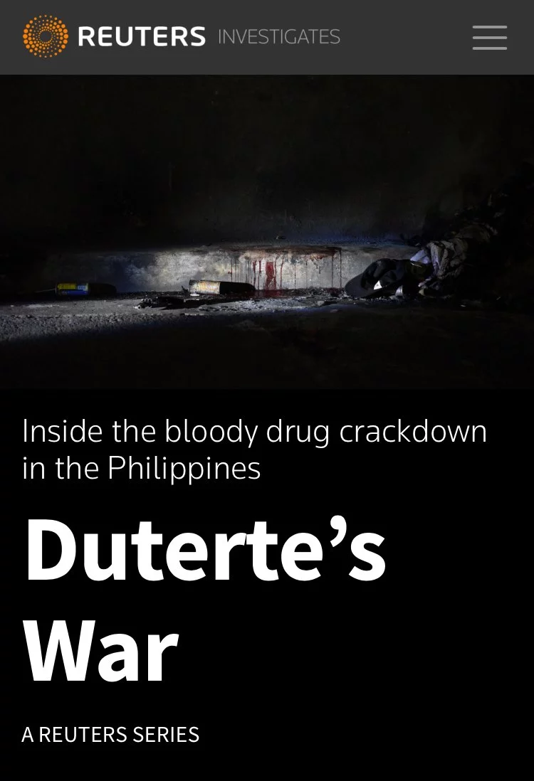 Тисячі вбивств, проведених без суду і слідства – наслідки кампанії проти наркотичної індустрії Філіппін від президента Родріго Дутерте. За словами репортерів Клер Болдвін, Ендрю Маршалла і Мануеля Могато, вони хотіли привернути увагу міжнародної спільноти до «брутальної кампанії вбивства» Дутерте.