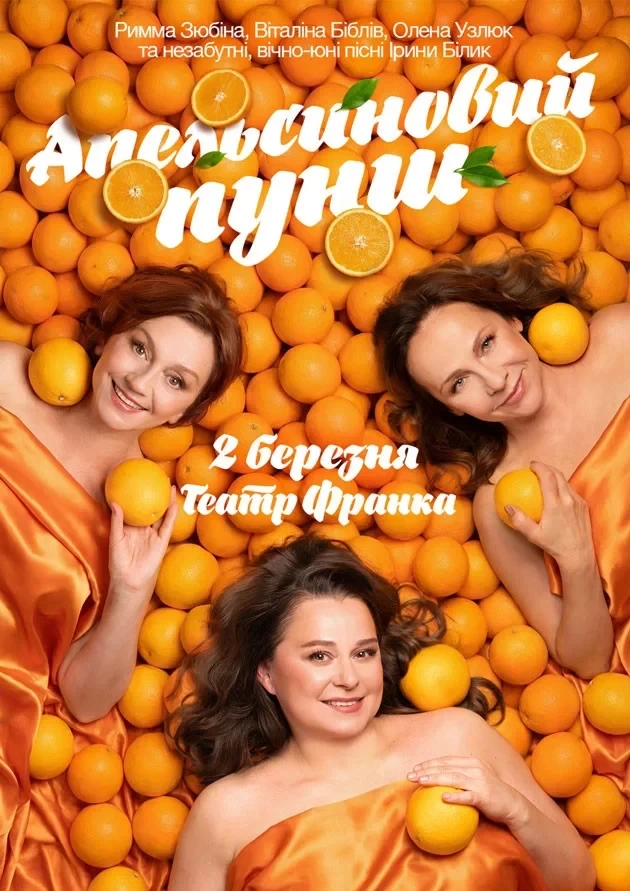 Акторка Ірма Вітовська втілює другу власну виставу після «Київської перепічки». У постановці вона зібрала зірковий акторський каст: Римма Зюбіна, Олеся Жураківська, Віталіна Біблів, Олена Узлюк та Інна Мірошниченко (два склади). Три жінки за п’ятдесят прощатимуться із власним минулим, а новий смак життя буде схожий на апельсиновий пунш.