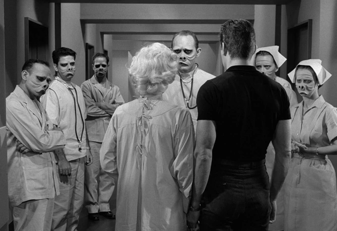 Кадр із серіалу «Сутінкова зона» 1965 року (рімейки виходили в 1985 році, 2002-му та 2019-му), який вважають одним із найбільш недооцінених телевізійних шоу. На Rotten Tomatoes оцінка від глядачів складає 95%, а від критиків – 92%