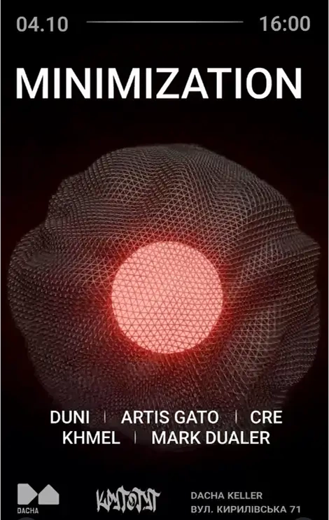 Minimization – фінальна вечірка літа з фокусом на мінімал, хаус і техно. Лайнап поєднує «румунські відтінки, глибокі груви, олдскульну енергію та нові авторські звучання»: Cre, Duni, Mark Dualer, Artis Gato, Khmel.