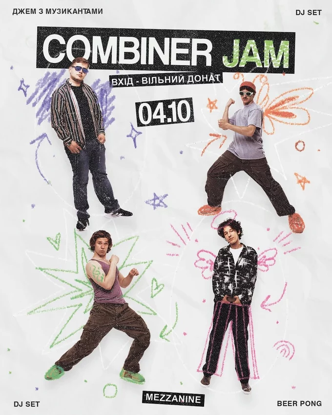 Combiner Jam – це вечір музичної імпровізації й танців у клубі Mezzanine на Нижньоюрківській. Гості зможуть джемити разом із музикантами, слухати діджейський сет, грати в бірпонг і брати участь у благодійних аукціонах на підтримку ЗСУ.