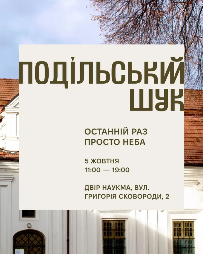 «Подільський Шук» – це благодійний ярмарок просто неба, де можна знайти вінтажні речі, вінілові платівки, хендмейд та активності від культурних проєктів. Це остання цьогорічна осіння зустріч у внутрішньому дворі НаУКМА.