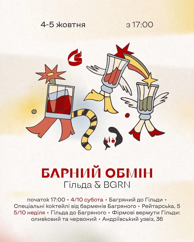 Два київські бари «Гільда» й «Багряний» обміняються коктейльними сетами. 4 жовтня «Гільда» запрошує гостей на спеціальні коктейлі барменів «Багряного», а 5 жовтня – «Багряний» презентує фірмові вермути «Гільди» (оливковий і червоний). Частина прибутку йде на підтримку підрозділу спеціального призначення НГУ на DJI Matrice 4T та акумулятори до нього.