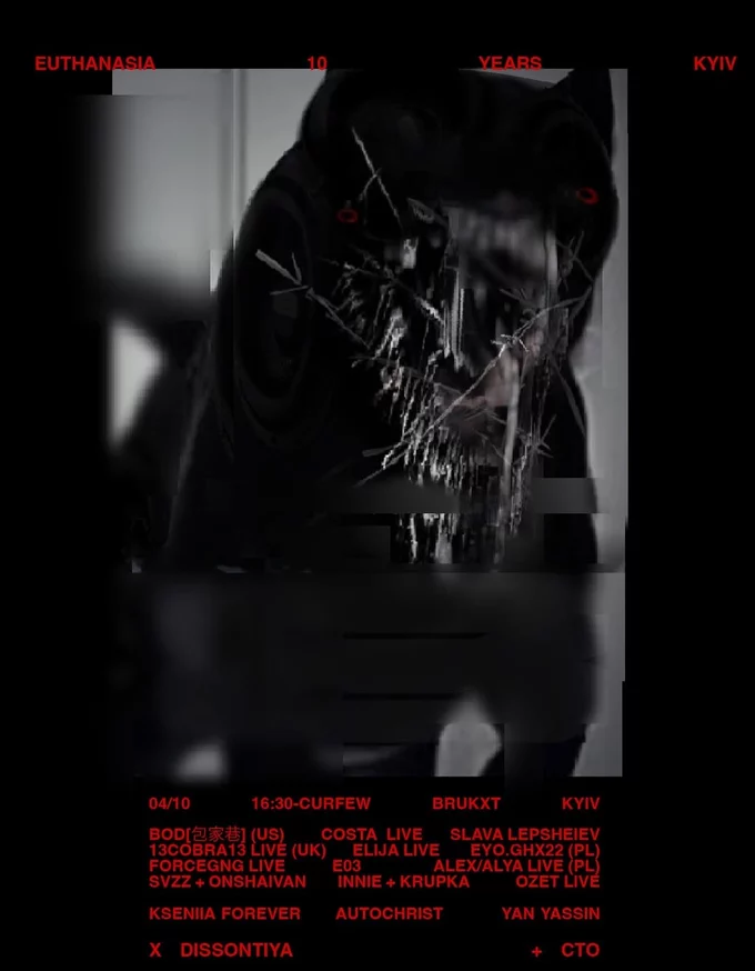 Ювілейна вечірка формації Euthanasia святкує 10 років у колаборації з київською формацією Dissontiya. Буде дві сцени – на вулиці й у приміщенні, тату-стейдж від CTO й виставка всередині клубу. У лайнапі понад 30 художників і колективів з усього світу, серед них Bod [包家巷] (США/Китай), 13Cobra13 (Велика Британія), Alys/Alex (Польща), Eyo.Ghx22 (Польща), Costa, Ozet, Slava Lepsheiev, Autochrist