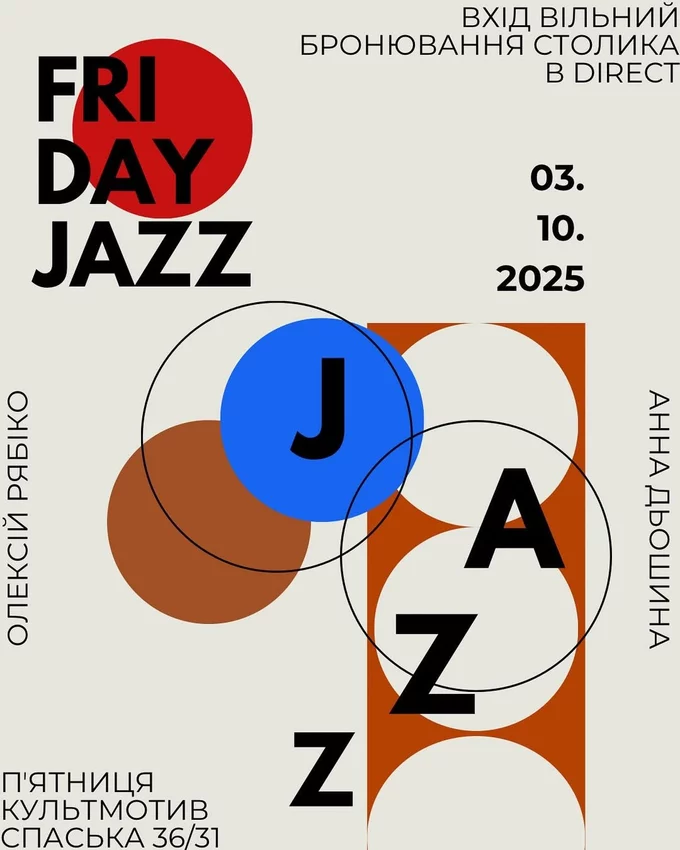 Джазмени Олексій Рябіко й Анна Дьошина весь вечір імпровізуватимуть для гостей «КультМотиву». Вхід вільний, але потрібно забронювати столик.