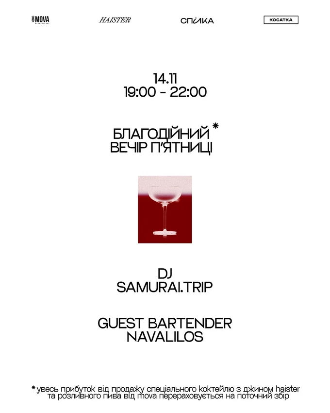 У пʼятницю «Спілка» організовує благодійний вечір у кафе «Косатка». Там будуть благодійні коктейлі, діджей-сети й пиво. 100% прибутку з продажу благодійних напоїв підуть на підтримку листопадового збору «Спілки» на «Чуйку 3.0» – пристрій радіоелектронної розвідки для бронегрупи ГУР МО «Кракен» – і на пікап для батальйону безпілотних систем «Щедрик».