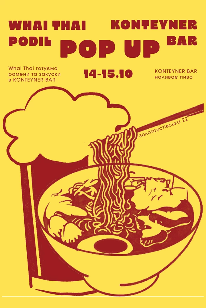 У закладах подумали й вирішили, що рамени й азійські закуски пасуватимуть до пива. Тому Konteyner наливатиме пиво, а Whai thai Podil подаватиме рамен, кімчі, биті огірки, гострі томати, салат із вушками та салат із куркою.