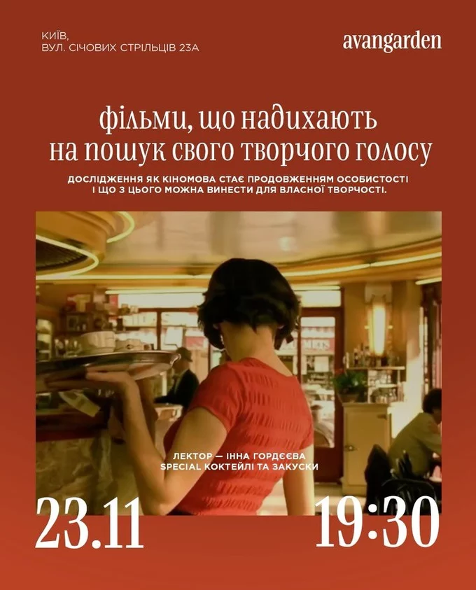 Це буде бесіда про те, як режисери будують власну кіномову, і як це може допомогти вам у власній творчості. Лекторка події – Інна Гордєєва, кінокритикиня й авторка телеграм-каналу «Нетфлікс головного мозку». Під час лекцій пригощатимуть лимонадами та коктейлями.