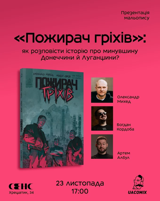 Мальопис «Пожирач гріхів» письменника Олександра Михеда й ілюстратора Андрія Дяківа розповідає історію становлення Донеччини. Крім Олександра, на презентації буде Богдан Кордоба, видавець UA Comix, а модеруватиме зустріч Артем Албул («Клятий раціоналіст»).