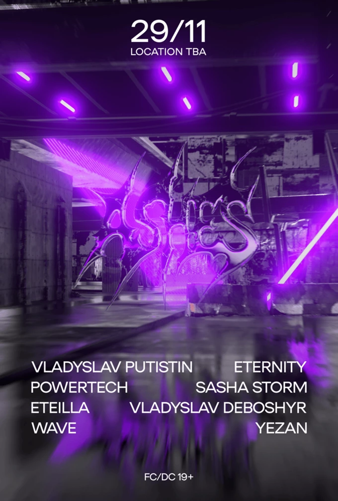 Ashes – це аудіовізуальна подія на секретній локації, де «лазерні системи синхронізують з аудіовібраціями». Кожному гостю видадуть спеціальні окуляри Ashes Vision для посилення ефекту й захисту від стробоскопів. У лайнапі Vladyslav Putistin, Powertech, Eteilla, Wave, Eternity, Sasha Storm, Vladyslav Deboshyr та Yezan.