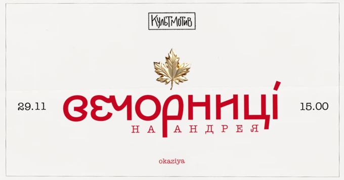 Культурний проєкт «Оказія» проводить Андріївські вечорниці та святкує свій день народження в «КультМотиві» на Подолі. На заході будуть традиційні співи, кусання калити, ворожіння та благодійний розіграш.