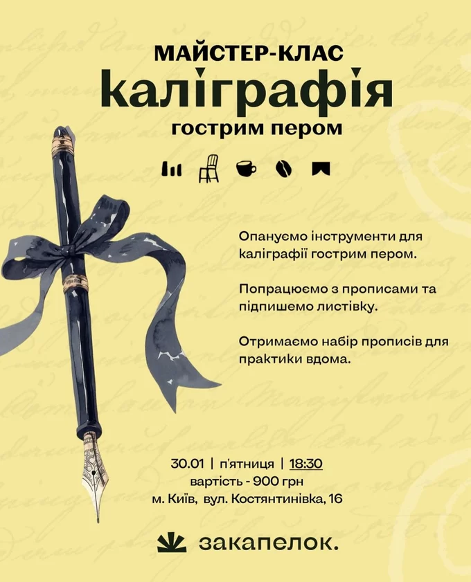 У книгарні-кавʼярні «Закапелок» відбудеться майстер-клас із каліграфії для початківців. Це нагода «сповільнитися, зосередитися на процесі письма й створити щось красиве власноруч», кажуть організатори.