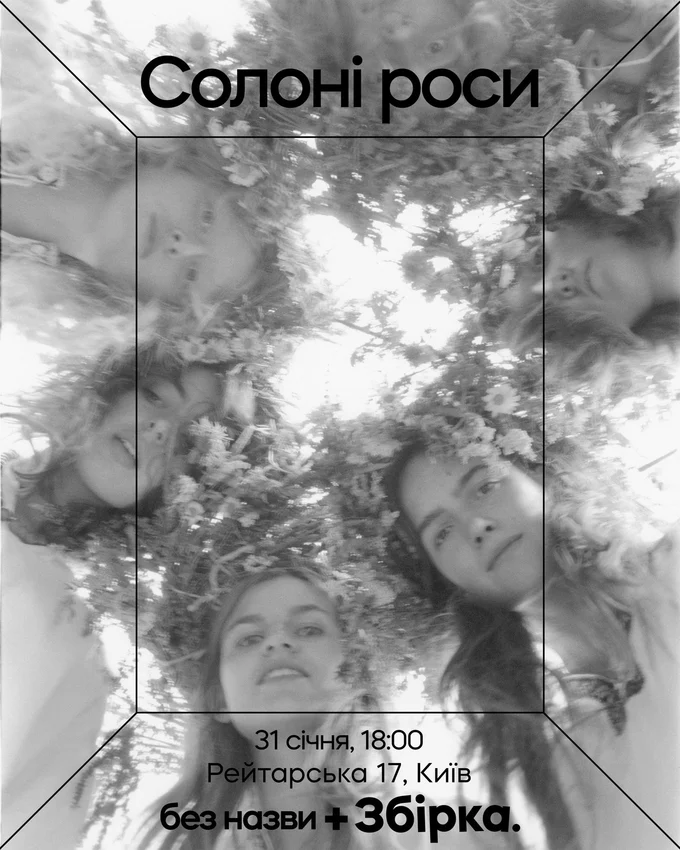 «Солоні роси» – це перша виставка фотографії в цьому році в галереї «Без назви» за участі фотографок Кристини Подобед, Дар’ї Свертілової, Анастасії Лазуренко, фотографа Євгена Волкова та художниці Сани Шахмурадової Танської. Крім виставки, у книгарні «Збірка» також презентують одноймену фотокнигу. Це історія про пам’ять і спільне проживання «тендітних, позачасових моментів», – кажуть авторки.