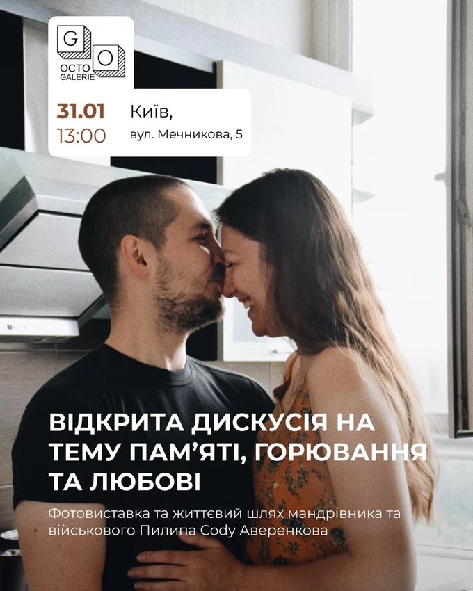 Дружина загиблого мандрівника та військового Пилипа “Cody” Аверенкова проведе в Octo Galerie відкриту дискусію про памʼять, любов і проживання горя.
