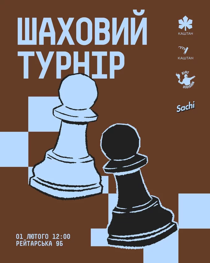 Шаховий турнір у «Каштані» проходитиме в сім турів, а партії триватимуть по 10 хвилин. Зіграти можуть усі охочі. Реєстрація учасників – об 11:30, а початок – за пів години. Для переможців обіцяють призи від Riot Division і Sachi Kombucha. Усі зібрані кошти підуть на збір закладу на автівку для 54-ї ОМБр імені Івана Мазепи.