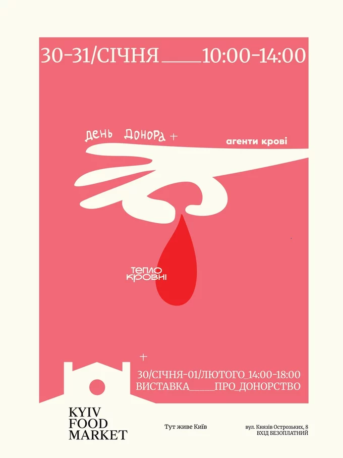 Це шанс поєднати приємне з корисним: поїсти та здати кров, щоб допомогти тим, хто цього потребує. 30 та 31 січня можна буде задонейтити кров за попередньою реєстрацією, а з 30 січня до 1 лютого (14:00–18:00) на першому поверсі простору проходитиме інтерактивна виставка про донорство.
