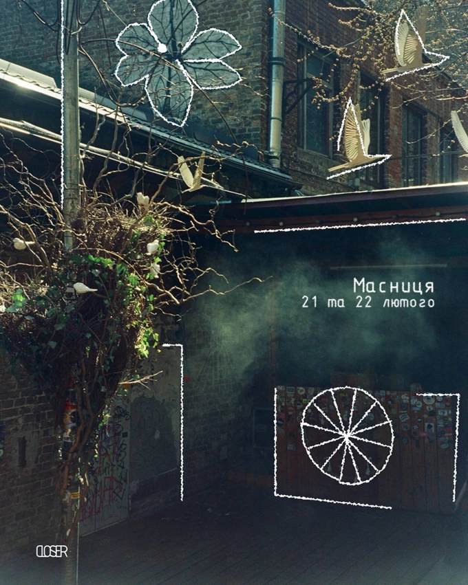 На свято Масниці у клубі на Нижньоюрківській проведуть народне гуляння: буде вогонь, опудало, живий гурт Hudaki Village Band і «ЩукаРиба» під супровід диджея Chocollab і майже всього лайнапу резидентів Closer. Savage Food готуватимуть млинці, а в неділю будуть танці просто неба.