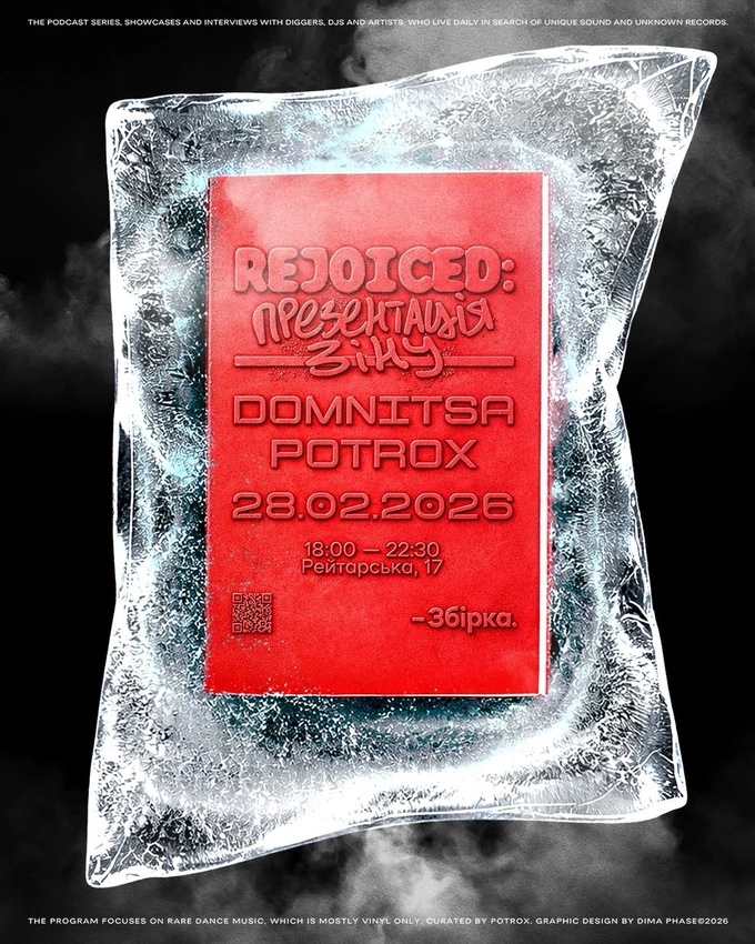 У книгарні «Збірка» презентуватимуть журнал про диджеїв, музичні лейбли, фестивалі й нічне життя. Це колаборація з вініловим радіошоу Rejoiced, яке у 2022 році заснував харківський диджей Potrox. Презентація проходитиме у форматі вечірки із сетами засновника проєкту й артистки Domnitsa Yurievna. Також на події проведуть живе інтервʼю з Potrox.
