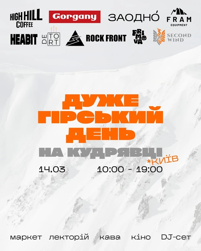 Це благодійна подія на Кудрявці, де обʼєднають маркет аутдор-брендів, лекції про гори, кінопоказ фільму «Друге дихання», каву й десерти та вечірній диджей-сет від Darialism. Усі зібрані кошти – на підтримку ЗСУ.