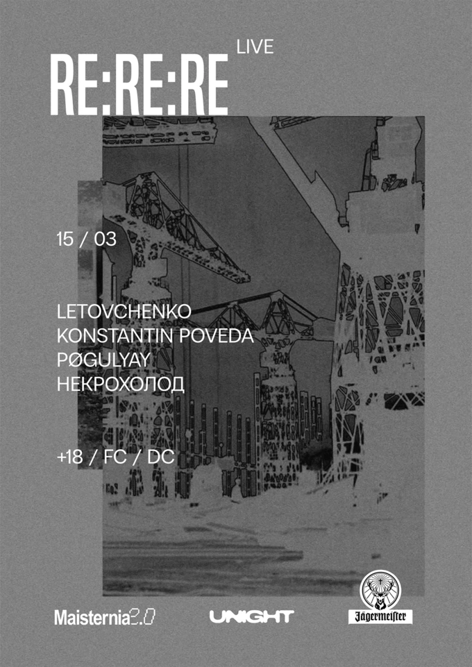 Експериментальна нойз-вечірка Re:Re:Re у трьох актах відбудеться у клубі Keller на Кирилівській. Будуть танцювальні перформанси, артінсталяції й музика від Letovchenko, Konstantin Poveda, Pøgulyay та «Некрохолод». 100% чистого прибутку з події перерахують на потреби ЗСУ.