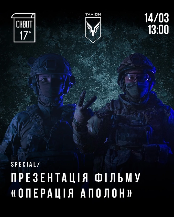 До Дня Добровольця, який відзначають 14 березня, у «Сквоті» представлять документальне кіно від батальйону «Таліон». У фільмі зібрали розповіді бійців і реальні штурми ворожих позицій, які зняли на нашоломні камери. Після показу – спілкування з військовослужбовцями. Усі зібрані на події донейти спрямують на ремонт «Хамві» для «Таліону».