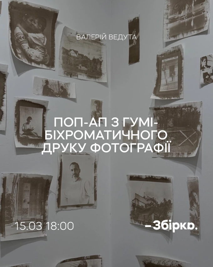 Фотограф Валерій Ведута створюватиме у «Збірці» світлини за технікою кінця 19 століття – гумібіхроматичним друком, а замість фарби використовуватимуть землю з Київщини й озера Сиваш. Готові відбитки можна забрати за донейт від 200 грн на дрони для батальйону «Вовки Да Вінчі».