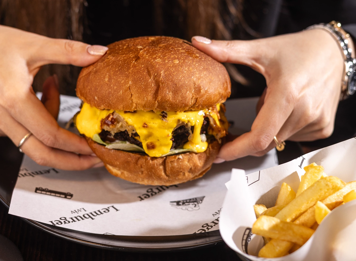 Великий, ситний, соковитий, із сирним соусом, смаженою цибулькою та свіжими овочами. Подають із картоплею фрі.