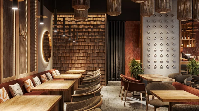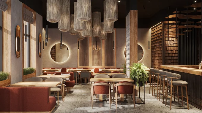Дизайн Nomi створив Юрій Черебетов із Seven Studio. «Це поєднання сучасної естетики, природних матеріалів і теплоти деталей», – описують інтер’єр у команді.