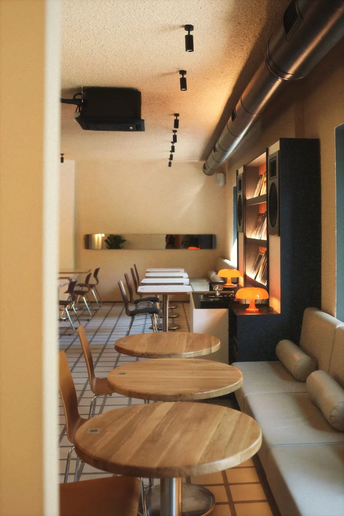 Дизайн розробляв В’ячеслав Баладинський, а айдентику для кафе створила дизайнерка Анастасія Тельпис. В інтер’єрі закладу поєднали натуральне дерево, склоблоки, вінтажні меблі та м’яке світло.