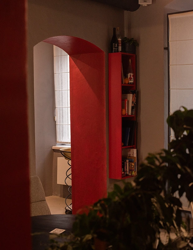 Інтер’єр закладу зробили у спокійних сірих і червоних тонах, із мармуровими деталями. Там є світильники з-під пляшок із вина з етикетками, велика пляшка-ваза, торшери, вазони, свічки, книги й настільні ігри. У закладі також є літній дворик (спільний із закладом «Плав») і тераса на вулиці.
