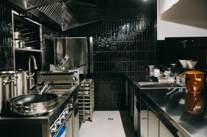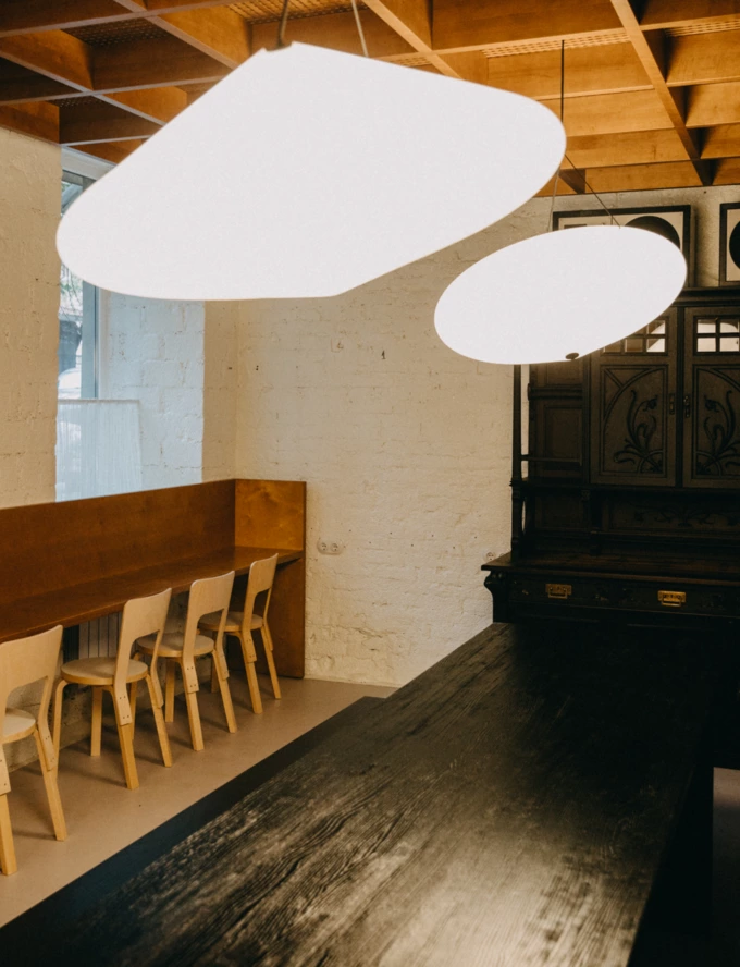 Сам заклад умовно поділили на дві частини: відкрита кухня поєднується із залою, де є великий стіл і стільниці. В інтер’єрі поєднали кілька відтінків дерева, клітчастий джапаністичний текстиль, метал і тепле освітлення. Над об’єктом працювало українське архітектурне бюро AKZ Architectura.