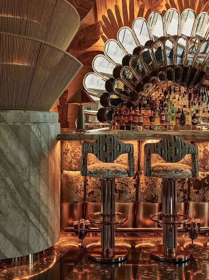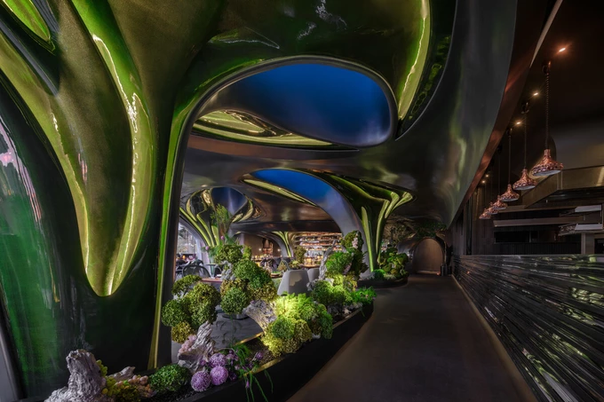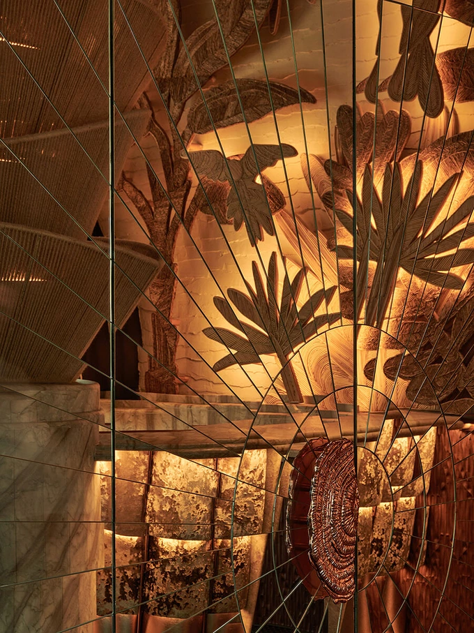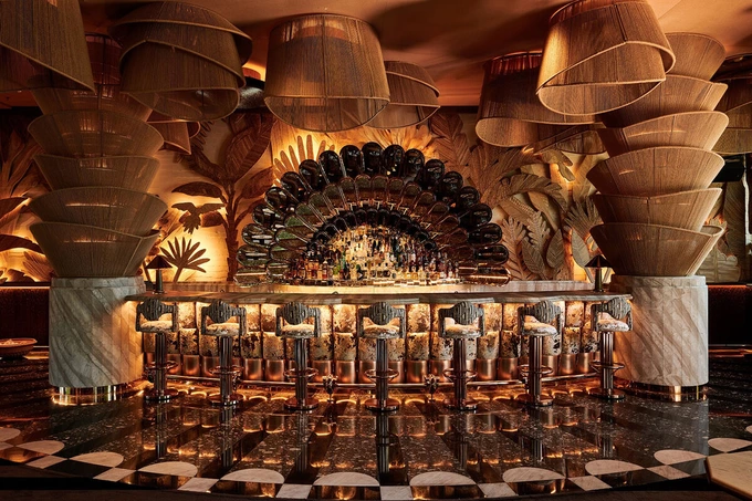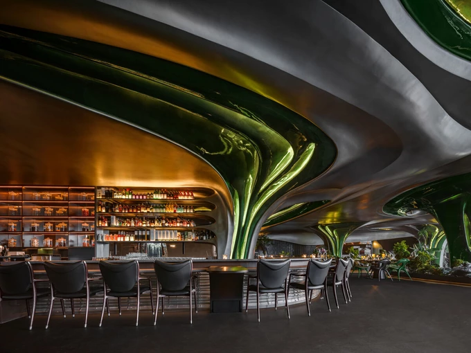 У барі намагалися максимально відтворити тему саду. Освітлення фільтрує сонячне світло й створює плямисті візерунки, що імітують затінені деревами місця. А вночі прямо в барі видно місяць і зорі – завдяки проєктору. Водночас металізована фарба, неіржавна сталь, вуглецеве волокно й вигнути скло «поєднують розкіш із футуризмом, занурюючи гостей у фантастичний світ, що не підвладний часу».