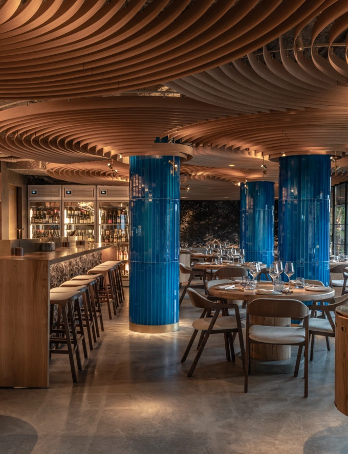 Головний акцент простору – стельова інсталяція, що нагадує концентричні кола на воді. «Вертикальні колони в ресторані створюють ефект простору, занурюють у прохолодну атмосферу моря та підкреслюють тему хвиль», – розказали YOD Group для Віледжа.