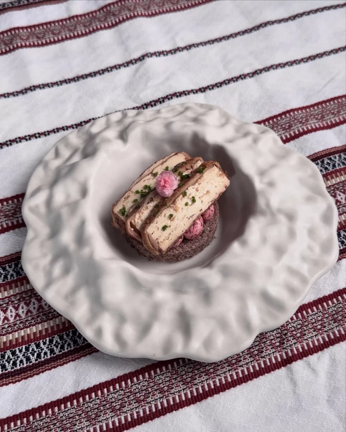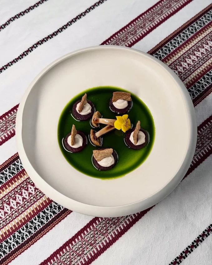 - Амюз-буш [мініатюрна закуска] – безе з фрешу дайкона, ферментований мигдалево-гречаний крем-сир та маринований кораловий гриб.